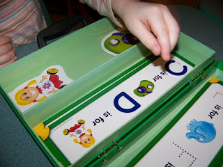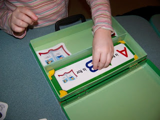 She discovered some different activity cards at the bottom of her stack. One was A B _ D E to help with letter order and another was _ a t with a picture of a hat to help with sounding out letters. As a preschool teacher, I think this is a fabulous learning center in a box. It's portable, it's child-sized, it's made of quality materials, and can be adapted to any preschool child's level of learning.