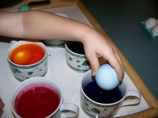The PAAS Egg Dye Kit comes with an assortment of stickers and deco-bands and even a wax crayon, but for the preschooler group, the dye is all we really need. The colors are always bright and beautiful, and I can depend on PAAS product's performance year after year. The PAAS website has activities and ideas for you to use with your children. Look at the fun we had today! Egg hunt coming up after naptime!