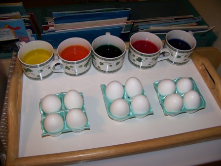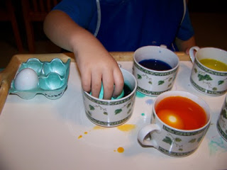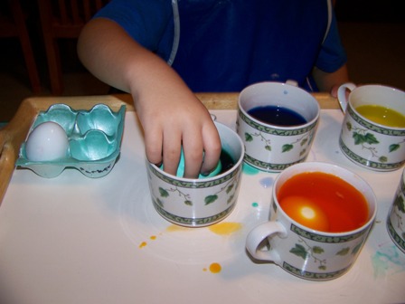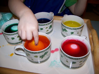 I cannot say enough wonderful things about the PAAS Egg Dye Kit. I've used it as long as I can remember and never even bothered trying another brand. The children love to drop the color dye tablets into vinegar, squealing with delight as the tablets sizzle and dissolve. We add water, hard boiled eggs, and have lots of paper towels nearby. Yes, it's messy, but messy is fun, and if kids aren't coming home from daycare messy and dirty, they probably aren't having much fun!