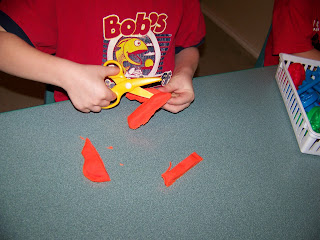 I love Playdoh. It has so many benefits. Playdoh lets children use their imagination in so many ways. Some of today's creations included bouncy balls, haircuts, cars, a turtle, spaghetti, worms, and pizza. They pushed and pulled and squished, working their little fingers, which actually builds fine motor muscles for writing. They pounded and punched, working large motor muscles in their arms. They pressed things into the Playdoh, similar to cookie cutting, but instead leaving imprints of insects, stars and animals, sparking many different conversations between them. They practiced their cutting skills with the dough scissors, which cut only dough (YAY). They smashed flat circles and used pizza cutters to make lunch for each other. Yes, I'll be picking Playdoh from the carpet and the little zigzags in their sneakers all day, but it's well worth the full hour of six contented preschoolers.