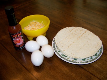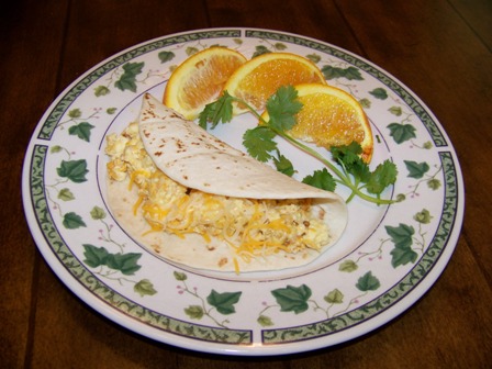 So a few minutes later, I'm sitting down to my healthy, portion-controlled breakfast of one breakfast taco, made of a flour tortilla, one scrambled egg, Bacon Hot Sauce cooked in, and shredded cheese, with a half of an orange on the side. Doesn't it look delicious?