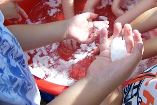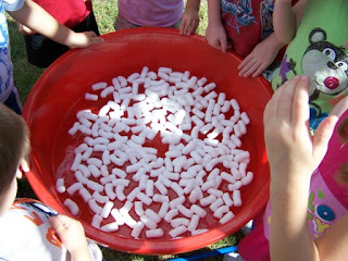 Today I wanted to demonstrate to the children in concrete terms what the word "dissolve" means. I filled up the water table with water and then poured biodegradeable packing peanuts into the water. All seven children gathered around to learn and discover.