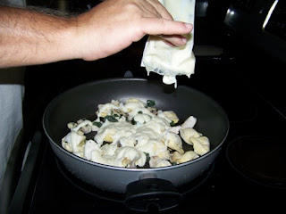 After defrosting the frozen sauce under a hot faucet, he poured it over the skillet contents. Again, easy.