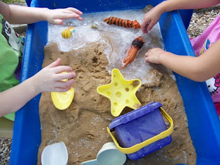 As the packing peanuts dissolved, the water became white and soapy. We talked about how bars of soap dissolve slowly and become smaller each time they are used. They decided to see if sand would dissolve, so a bucket was used to transport water from the water table to the sand table.