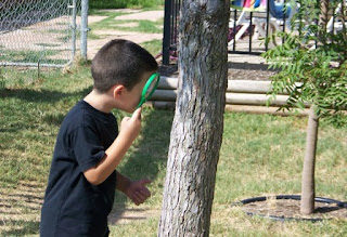 Using scientist tools, called magnifying glasses, the children set out to find the fun in science. Their observant little eyes discovered the veins that run through the leaves and the stem of the leaf gets bigger closer to where it touches the branches.