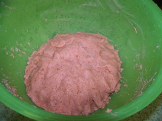 Then I mixed half a container of strawberry frosting into the bowl of crumbled cake. Stir? Ha, not me, I stuck my hands in there like it was meatloaf. Once it was all mixed up, it was a slightly sticky substance and I put the whole bowl in the freezer for half an hour. Again, keep the teens away from the batter, because really it's just cake with frosting and they will eat it. It didn't seem like very much as far as quantity.