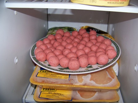 So after I walked the dog, I took the batter out of the freezer and rolled it into little balls with my hands (can you tell I work with kids for a living?) and set them on a big plate. It was a bit like using play-dough but stickier. I kept a small bowl of water nearby so I could dampen my hands while I was making the ball. It kept my hands from getting too sticky, but you have to be careful not to overuse the water too.