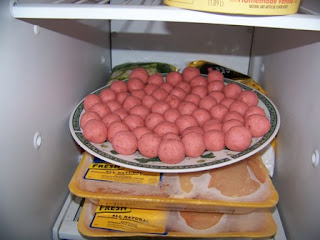 The balls are about the size of melon balls and this is how many I got out of one box of cake mix. I'd say offhand it's about 4 dozen. You can count them if you have that kind of time. Warn your teenagers there is a monster in the freezer that will eat them if they go in there looking for a snack. I put the rolled balls on the plate back into the freezer for another half an hour. In retrospect, I'd probably freeze them for several hours if not overnight. But I had to finish last night.