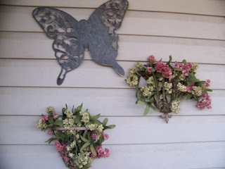 My metal butterfly graces the siding wall on my back deck, with two metal sconces that I filled with scrunched up flower garland that I got at a discount store. I love the way fake flowers never die. These look great year round and have lasted me several years through heat, wind and storms. I'm not an expert at gardening and I hate pulling weeds, so I try to choose low-maintenance outdoor plants and decor.