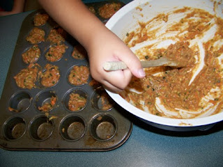 After all the dry foods were mixed, the two types of batter were combined into one bowl. All six kids watched with interest as the muffin mix was stirred. One child asked me why it was so colorful. I asked what the children's thoughts were on that, and got the right answer from one of them - "Because the vegetables are so colorful!"