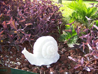 This is one of my favorite items, a resin snail. He's about twelve inches tall and sits on volcanic rock in my front garden, surrounded by Wandering Jew plants and a Sago Palm. I actually gifted this to myself from a friend. No I didn't steal it. She moved and told me she left a bunch of stuff in her back yard for me to go through and have anything I wanted. This snail was part of the truckload of items I took with me.