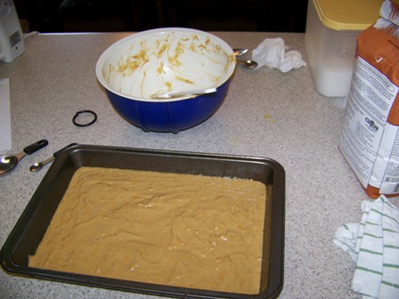 Pour into 9"x13" metal pan, let set while preheating oven. Preheat oven to 350 degrees F, then bake mango cake 45-50 minutes or until toothpick inserted in center comes out clean.