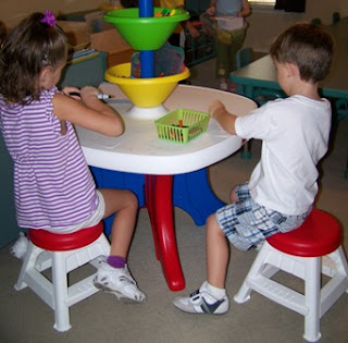 I loaded it all up with markers, colored pencils, stencils, and a tray of paper, plus a little basket of crayons (two of each color). Since there are two chairs, the plan is for two children at a time at the art table, which was what it was before our last table was retired. I couldn't wait to see their faces the next day!