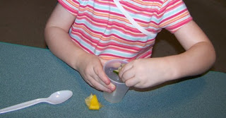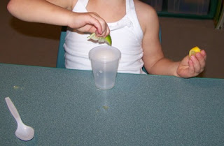 Give each child a small cup and show them how to squeeze the lemon and lime juice out of the fruit. The easiest way for preschoolers is to fold the fruit fourth in half and squeeze. Give each child a spoon to scoop out the seeds that may fall in the cup. Ask them do they HEAR a sound (the fifth sense) when the juice drips down in the cup.