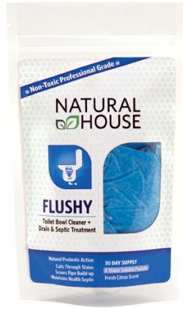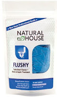 I have three toilets and I was really torn on which one got to experience the magic of Natural House. It was a real toss up between the teenage boys' toilet and the daycare kids' toilet. I finally settled on the daycare toilet downstairs since that's the one I have to use during the day. I can totally avoid the teenage boys' bathroom, thank God. So Flushy went for a swim.