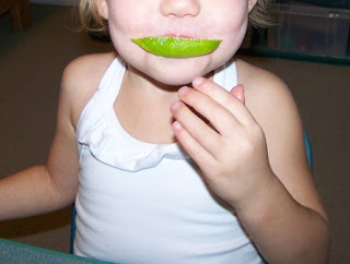 First show them a lemon. Ask! They almost always know what it is. Then show them a lime. Ask! Almost none of them will know what it is. Then while you are cutting the lemons and limes (1/4 for each child), tell them when you cut in HALF, then tell them when you cut in FOURTHS. Explain how half is two and fourths is four. Talk about the sense of SEEING. Give each child 1/4 lemon and 1/4 lime. Talk about the sense of SMELL. Ask them how the peel feels. Ask them how the inner pulp feels. Talk about the sense of TOUCH. Encourage them (get your camera ready) to lick each lemon and lime piece. Talk about the sense of TASTE. As you talk about taste, teach them the words sour and tart.