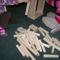 Two large planks became the base. The long blocks enticed the girls to stand them upright and I stepped back to take photos and observe, rather than interact. A four year old and two year old worked together, the older one instructing the younger one on which pieces to bring and how to arrange them.