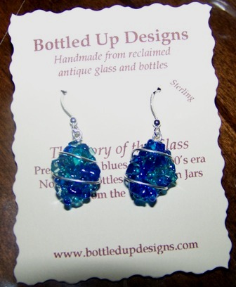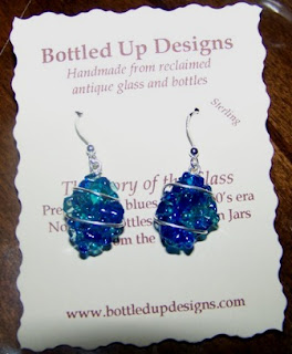 I just received the prettiest pair of earrings! I LOVE THESE. Since I wear blue jeans most of the time, I will be wearing these often. Laura Bergman designed and handmade these earrings from reclaimed antique glass and bottles. Yes, friends, you are looking at a fusion of 1930's Mason Jars and 1950's Noxzema bottles. How cool is THAT?