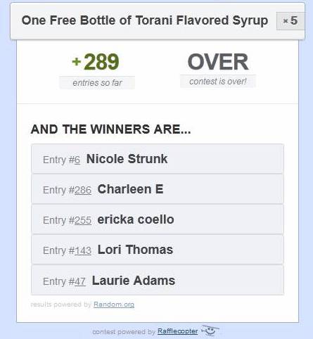 - Torani Flavored Syrups - FIVE winners - Ends Nov 11