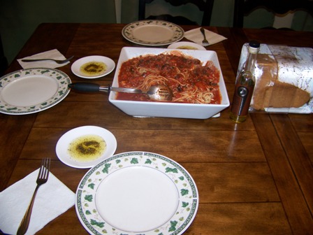 My amazing husband made his homemade spaghetti sauce for dinner and added 1 teaspoon of Extravagonza Roasted Garlic Culinary Oil to the sauce pot. While the spaghetti noodles rolled to a boil and the sauce simmered gently, I sliced the bread and set the table.