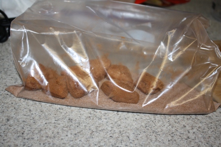 Then I dropped the biscuit triangles by eights into the plastic bag and shook up the bag to coat them with the cinnamon sugar.