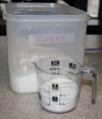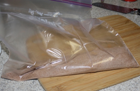 Then I measured out about a cup of sugar and about two tablespoons of cinnamon, dumped them both into a zipper closure plastic bag, and shook it up.