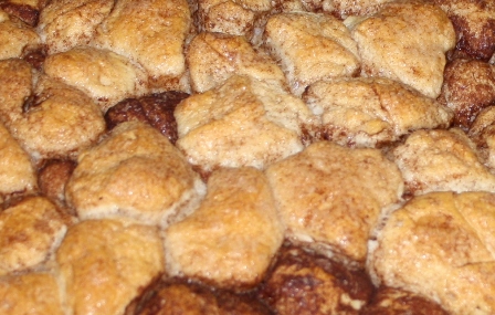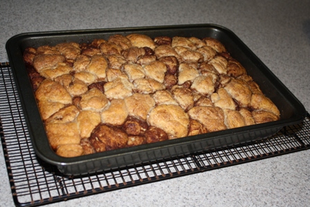 I poured the cinnamon butter all over the biscuit pieces in the pan. I wanted to make sure I coated the lighter colored pieces since they had less cinnamon sugar on them.