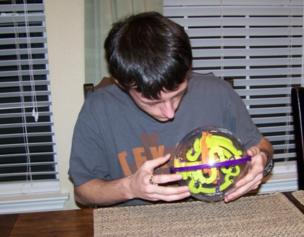 After the little ones all got a turn to try and make the ball roll in the tracks of the Perplexus, I placed it on the kitchen table, in anticipation of it capturing my teens' attention. It simply called out to John, who is 17. As soon as dinner was over, he grabbed it.