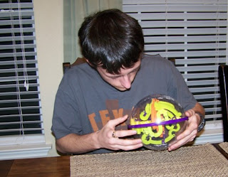 He finally relented and let her hold it. She asked me, "What is it?" I said, "It's called Perplexus." She furrowed her eyebrows together and said, "What does that mean?" I told her the name of it likely derived from the word perplexing, which means confusing or puzzling. She tilted her head to the side and said, "Well, it's definitely confusing me!"