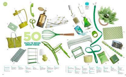 The Last Words: Other Ways to Go Green (page 132): Even though the color green is our theme, we embrace the green movement, too. Here, designers and tastemakers spotlight their favorite eco-friendly products, from detergent and dishes to wood finishes and throw pillows.