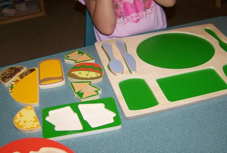 Using all the pieces of three of the American food trays, we sorted all the items into food groups. Then we worked in small groups to see who could put together their tray the fastest. I then put the three Sorting Food Trays into the manipulatives center to see how the children interacted with the toys during their unstructured play time.