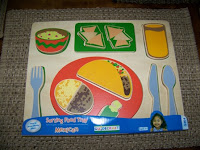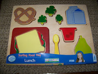 As a class, we explored each tray individually at first, starting with the Breakfast, then Lunch, then Dinner, naming the different items on the tray. We talked about healthy foods and how they help give us "fuel" so we can play and learn. The pieces are chunky and easy to grasp and hold so even the toddlers can enjoy these toys.