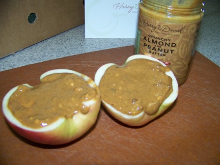 Inside the gift box was six beautiful apples with crunchy almond and peanut butter, plus a bag of roasted salted trail mix. I cut one of the apples in half, then used a melon-baller to scoop out the seeds. Using a spoon, I stirred up the almond and peanut butter and filled the apple centers, then smeared some extra across the apples. (Check out our peanut butter cookie recipe HERE!)