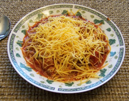 Dinner - I guess I'll call it Spaghetti Soup. My son Johnathan wanted to make spaghetti, so when dinner was ready, I grabbed a bowl of sauce and put shredded cheddar on top, and ate it with a spoon. Soup ingredients - diced tomatoes, tomato paste, water, mushrooms, black olives, ground beef. Delicious!!