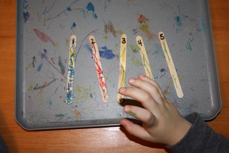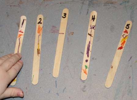 Each child gets five popsicle sticks. Count them out loud together, touching each stick. Number each stick with 1, 2, 3, 4, and 5. Put them in order. Count them out loud together, touching each number. Put them in reverse order. Count them backwards out loud together, touching each number. Mix them up and put them in order again.