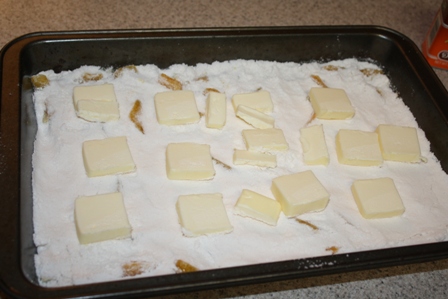 Cut up the stick of butter and place the pieces of butter all over the top of the yellow cake mix.