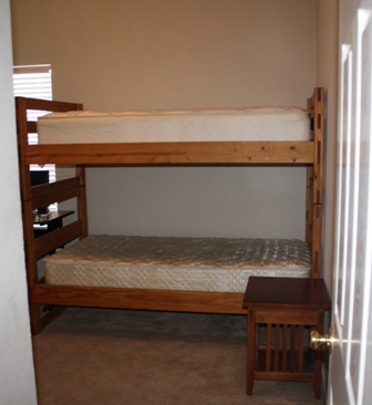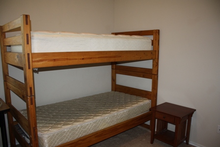 The dresser is big enough to pack a few days worth of clothing into the drawers. It's also pretty close to the color of the bunkbeds. Since the top bunk railing and ladder are many years gone, the sturdy little nightstand is the perfect step up to the top bunk (I discovered this when I went to make up the beds).