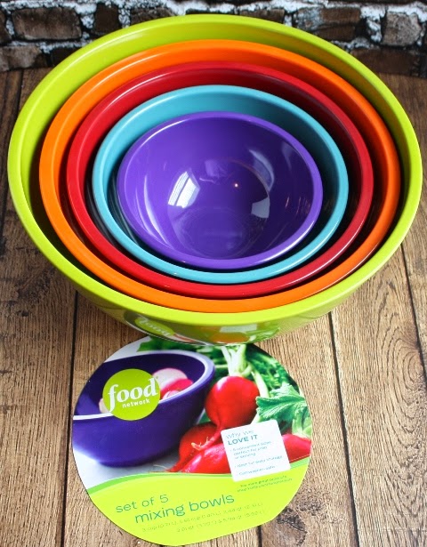 Mixing Bowls from Food Network is awesome! The bowls are made of a hard plastic with a rim around the edge so I can keep a firm hold on the bowl while I'm stirring. They are sturdy and having five different sizes means I have a bowl for every job. I love the rainbow of colors!