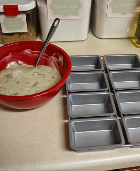 Next, I whipped up eight little blueberry sweet breads. My new mixing bowls came in handy again! I have even been using the littlest bowl to toss my empty eggshells into, rather than try to dash across the room to the trashcan before dripping goo on my floor.