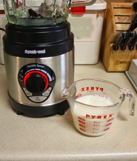 First, you need one cup of liquid. You can use milk, juice, yogurt (a semi-liquid), or even water. I like to use milk because I'm not a big milk-drinker but I know I need the calcium to keep my bones strong and healthy.