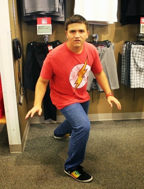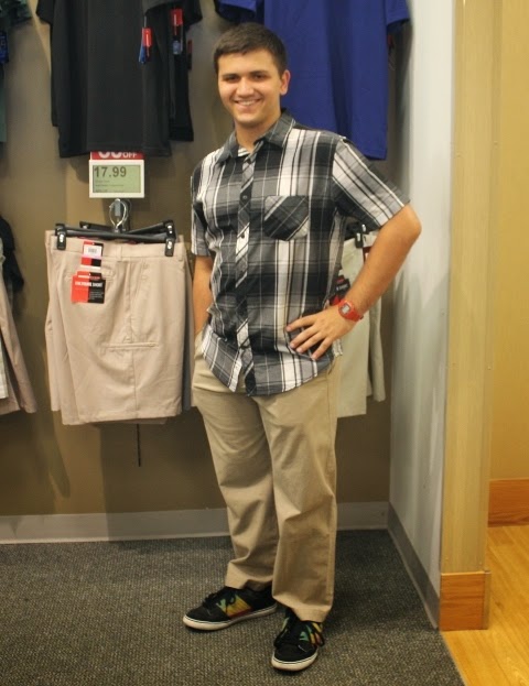 He did pick out one "nice" outfit with khaki pants and a button up shirt, but the rest of his choices were very casual since he sits in a classroom most of the day. Ryan is so much fun to shop with, because he knows I'm going to take pictures throughout the entire process, and he's a willing and animated model for my blog posts!