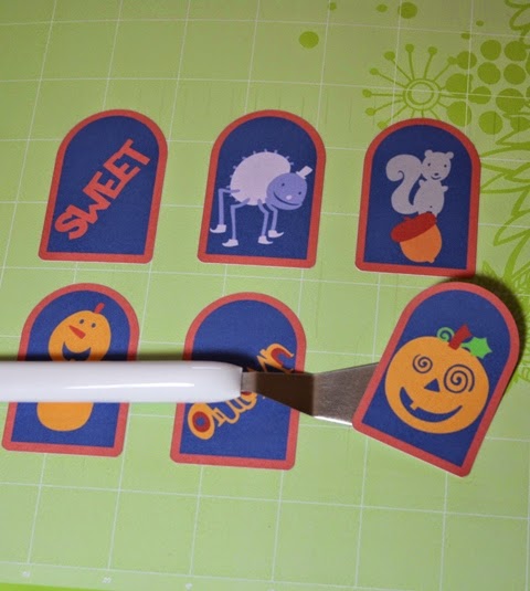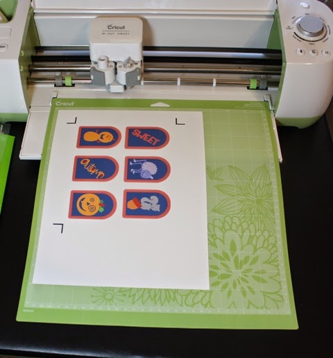 My very first project was Halloween Tags for a candy display I'm putting together. Using the Cricut Design Space, I used their free images from their library to create six tags with Halloween images on them. I can easily edit, resize, and even add my own text if I want in their Design Space. Then with a click of my mouse, I printed it on my printer, and set it on the Cricut cutting mat.