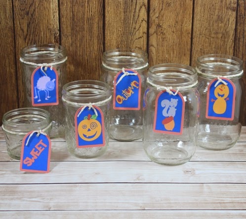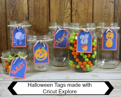 Cricut also offers tons of great tools that help me create and I love this flat one that helps me easily remove my cut cardstock from the cutting mat. To make my Halloween tags, I next made a tiny hole in the top of each tag and strung embroidery thread through the holes. I tied each one around different sizes of mason jars to create my display. I can fill them with candy or even use them to serve drinks at a party! Check out my Halloween Candy Display!