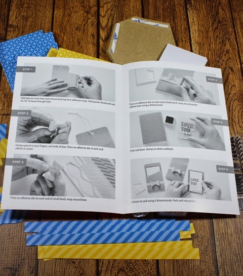 The "Love You A Lot" kit includes a photopolymer stamp set, two different colors of Stampin' Up! ink pads, 8 cards in 2 colors, 8 white cardstock pieces, 2 sheets of ready-to-assemble paper bows, 8 kraft pockets, two colors of baker's twine, 50 adhesive dots, and 50 adhesive 3D foam dots.