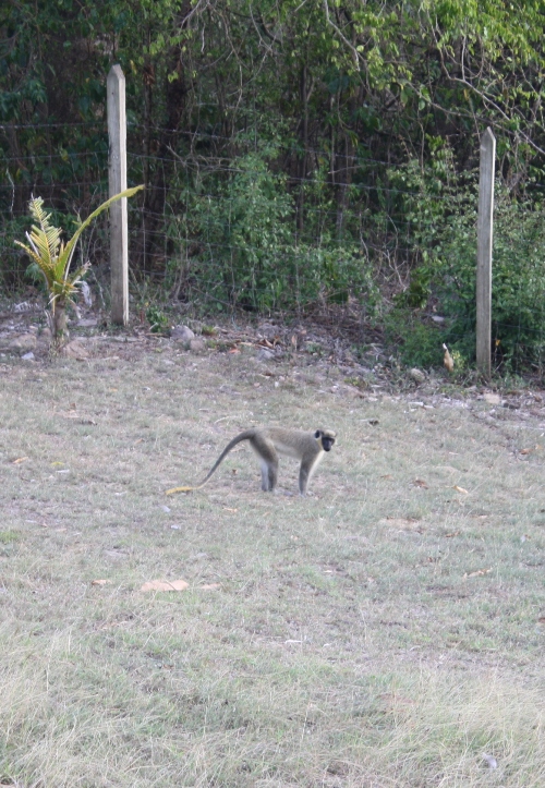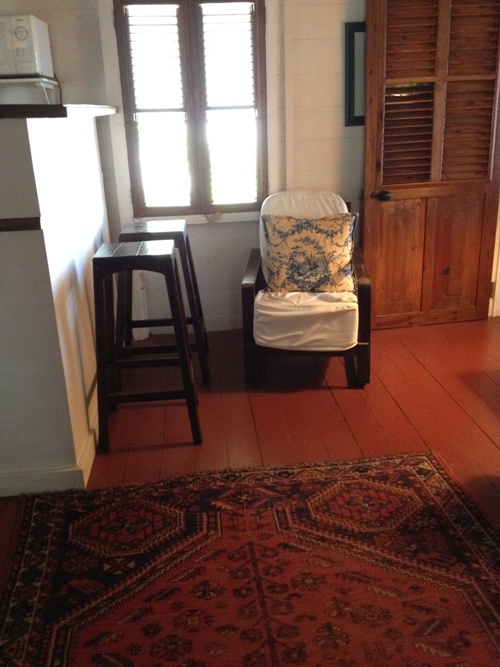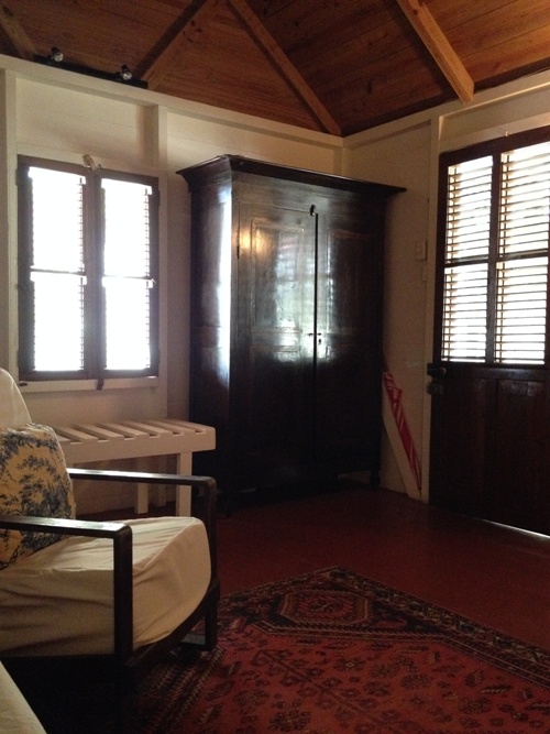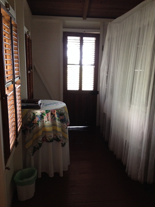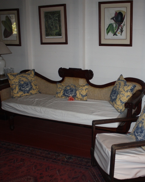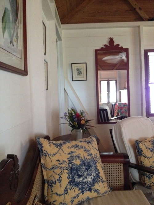 I was welcomed there for the week of the Nevis Mango Fest. My "hotel room" was a wooden cottage called Pasture House, possibly because of the small pasture directly below my balcony where the monkeys would come play at dawn and dusk. As I walked into Pasture House, there was a sitting room filled with charming antique furniture.