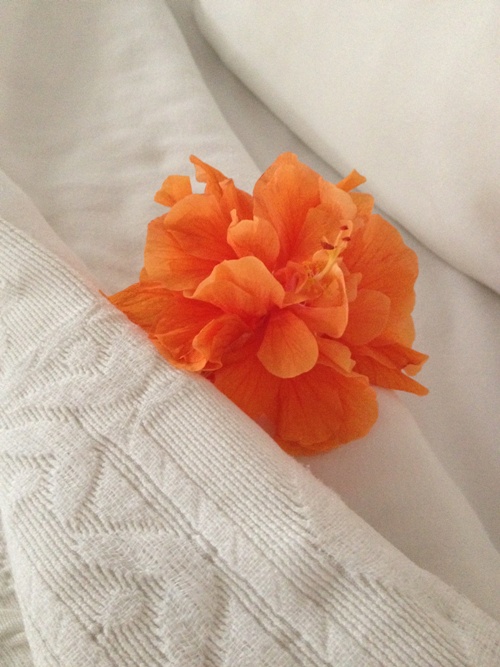 The back door of the bedroom leads to the balcony. The day I arrived, there were tiny flower petals spelling out the word "welcome" on my bed. Each day that the housekeeper cleaned, she left fresh flowers on my bed and sofa.