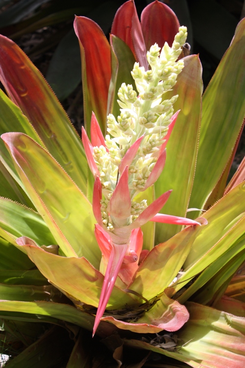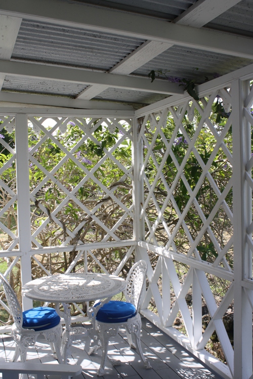 To the right and left I could see all kinds of trees, including a cocoa tree, cinnamon tree, mango trees, palm trees, coconut trees. I could see many plants and flowers, including a gorgeous vine that grows up the corner of the balcony, featuring tiny purple flowers. Several times I even saw a hummingbird enjoying the flowers.