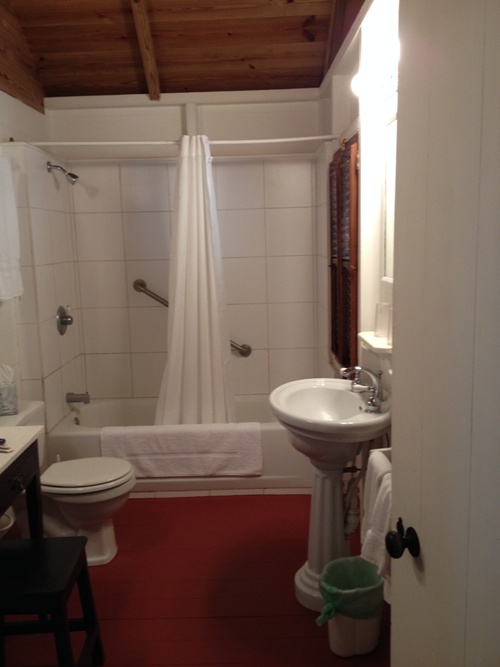 The bathroom has a door from both the bedroom and the sitting room. There is a tub/shower combination, a sink, a toilet, a vanity table and two mirrors. The shower water pressure was fantastic. They provide shampoo, conditioner, soap, and plenty of towels.