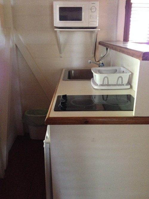 In the corner of the sitting room there is a kitchenette, complete with sink, cooktop, fridge, coffee maker, microwave, and dishes. The little wooden cottage is designed to be a home away from home. Staying at