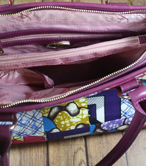 I am so excited to share pictures of my new Fricaine handbag with you! I own one other bag from Fricaine; I carry it daily and it shows no wear at all. Everywhere I go, people comment on how beautiful it is. This Fricaine Lagosian Satchel is sure to get the same attention.The Lagosian Satchel features a gorgeous quilted exterior design. The fabric is 100% cotton printed by using a special wax printing technology. Four different patterns make up the quilted squares. It's accented with beautiful high-quality synthetic leather and gold-plated forged hardware that never corrodes.